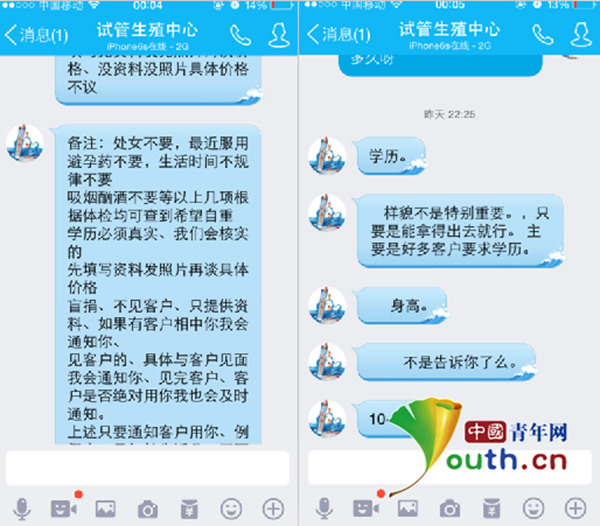 收到记者的个人信息后,中介进一步要求记者发4张近期照片和学历证明给客户看。中介表示,学历证明会在学信网核实,捐卵者的长相不太重要,客户比较看重学历。此外处女不要,最近服用避孕药的不要,作息时间不规律的不要,吸烟酗酒者不要。中介提醒,以上几项根据体检都能查出来,希望捐卵者自重。
